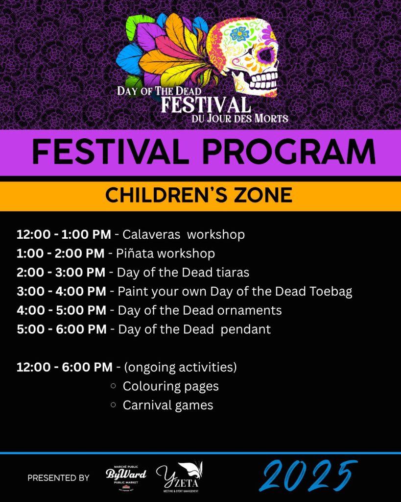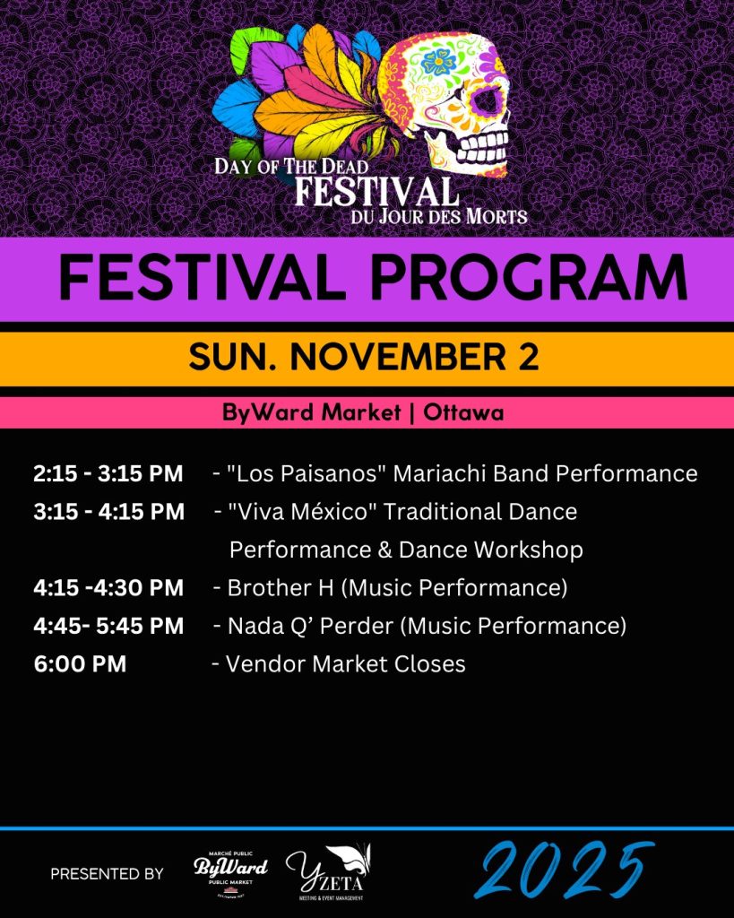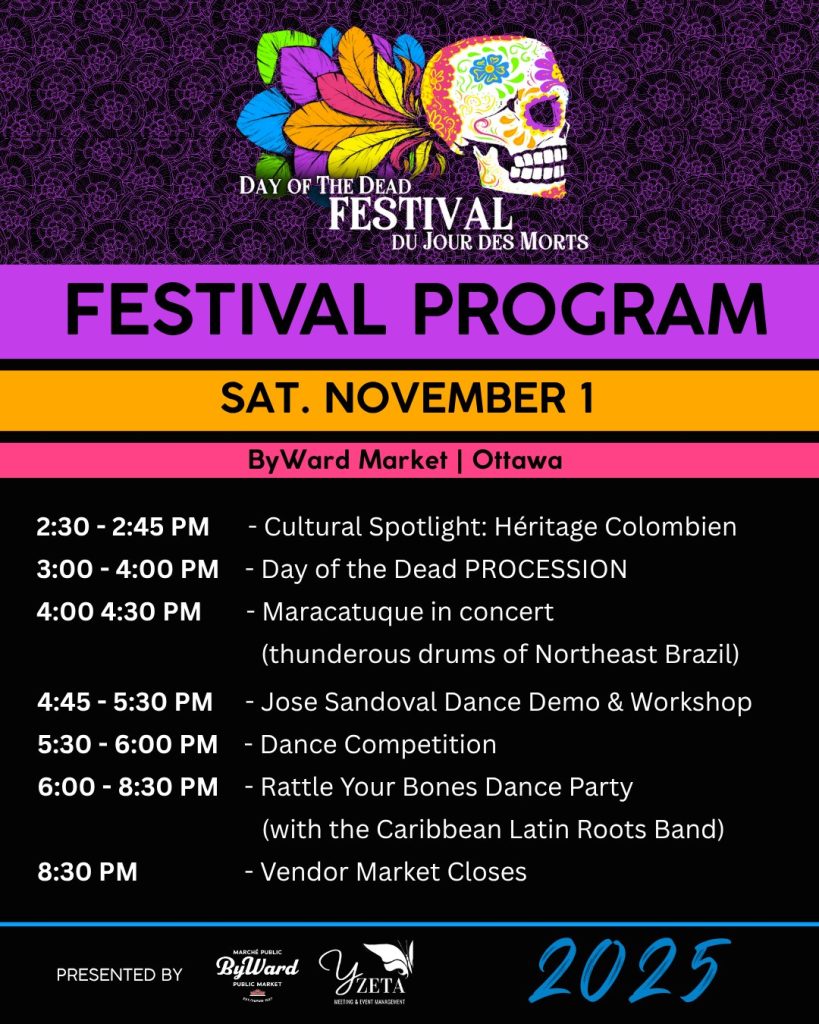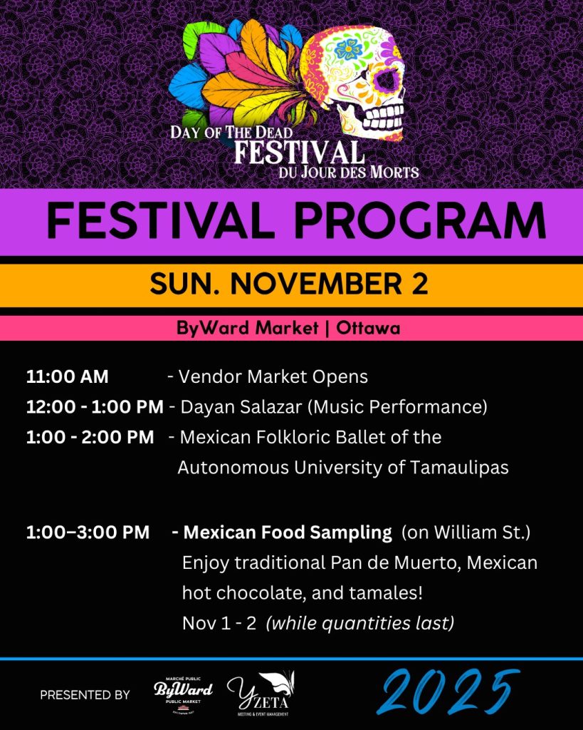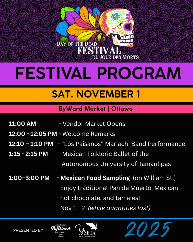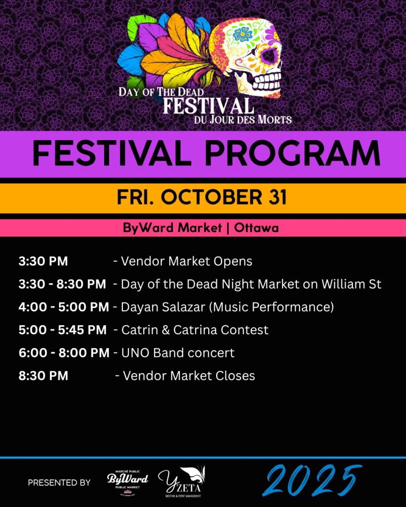Our next event is the Day of the Dead Festival in the ByWard Market. It runs Friday, October 31, to Sunday, November 2, 2025. We’ll be on William Street. Please stop by and say hi. It is a wonderful free event that brings cultures together.